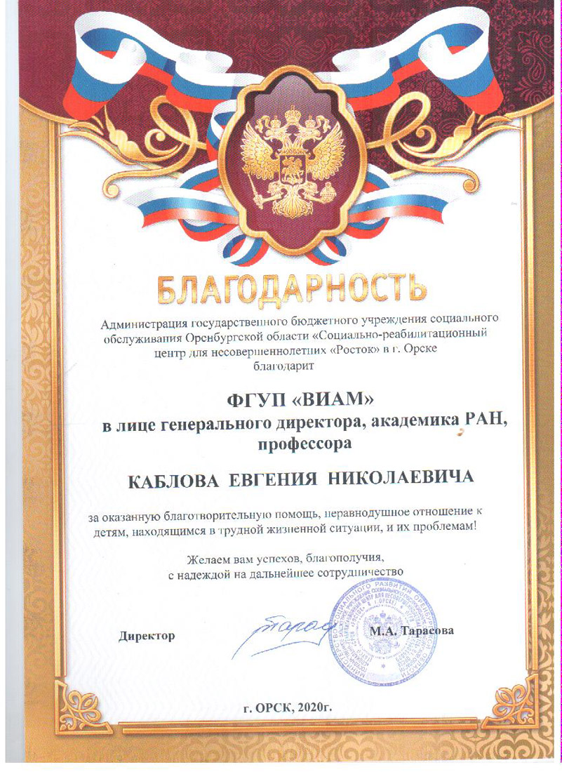 Директор центра М.А. Тарасова благодарит ВИАМ за «оказанную благотворительную помощь, неравнодушное отношение к детям, находящимся в трудной жизненной ситуации, и их проблемам!».
