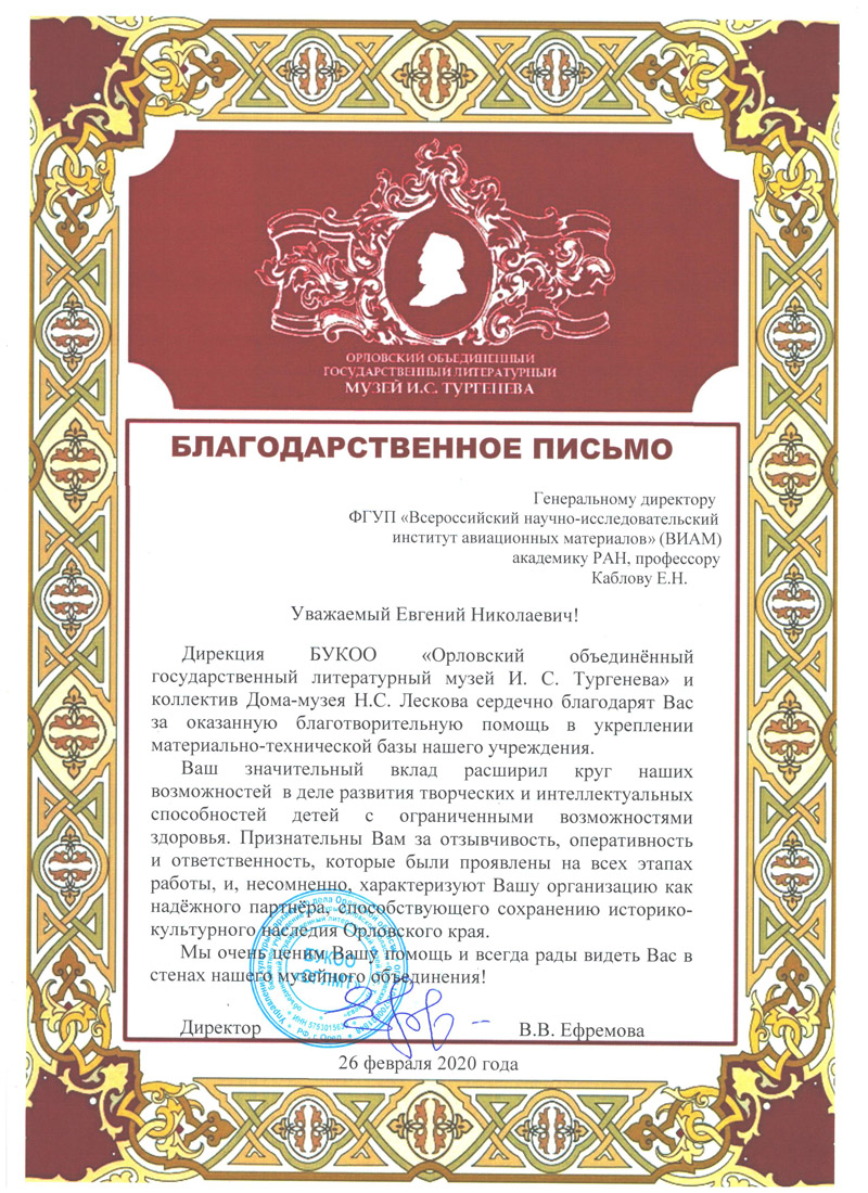Директор Объединения государственных литературно-мемориальных музеев Пензенской области Н.Н. Полева выражает Е.Н. Каблову и коллективу института благодарность и сердечную признательность за помощь, которая во многом будет способствовать популяризации творческого наследия писателя. «Благодаря таким коллективам как ваш, культура России продолжает жить и развиваться», – отметила она.