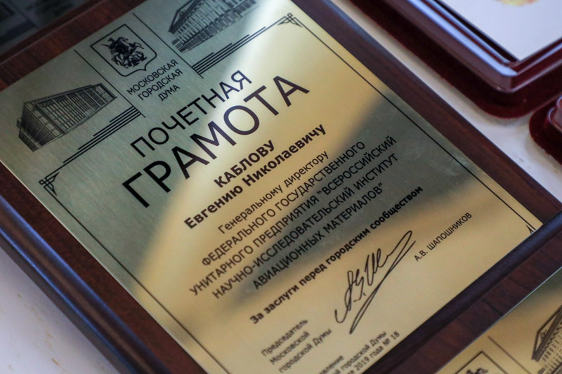За заслуги перед городским сообществом Почетной грамотой Московской городской Думы награжден Генеральный директор Всероссийского научно-исследовательского института авиационных материалов (ВИАМ), академик РАН Евгений Николаевич Каблов.