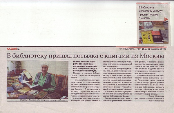 Сотрудники и читатели Межпоселенческой центральной районной библиотеки Кемского района (Республика Карелия) выражают огромную благодарность за книги военно-патриотического, научного и исторического характера, классическую художественную литературу.