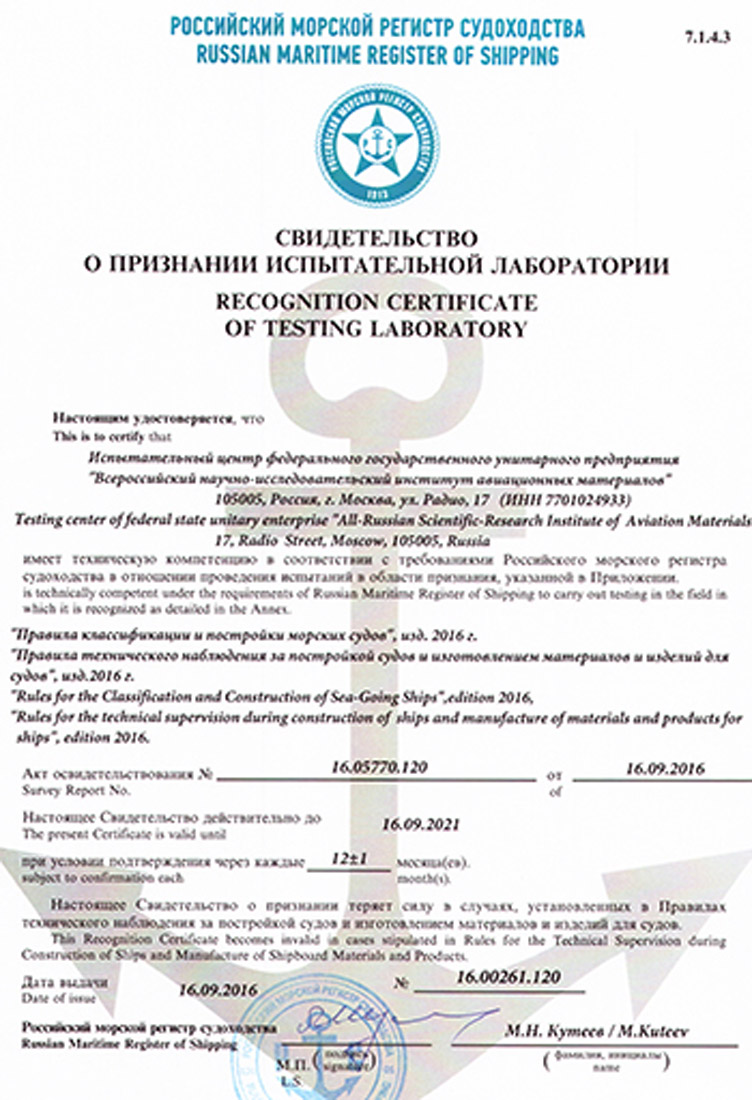 Напомним, что в 2016 году ИЦ ВИАМ получил свидетельство о признании Российским морским регистром судоходства, которое было выдано на основании положительных результатов инспекции. Документ подтверждает техническую компетенцию Испытательного центра в соответствии с требованиями РС.